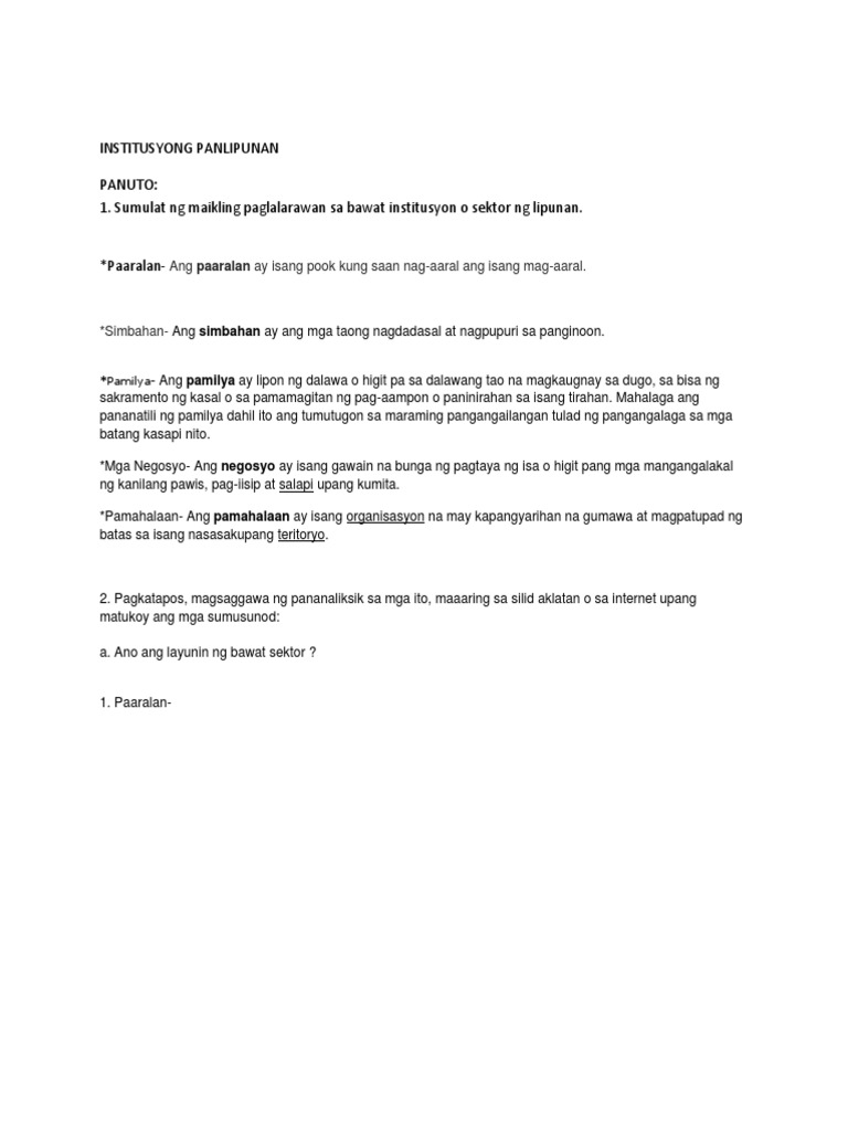 Halimbawa ang sektor ng edukasyon ay naglalayong bigyan ng kaalaman ang bawat bahagi ng kanilang lipunan sa pamamagitan ng mga leksiyon sa paaralan. Filipino 28102019 1828 danigirl12. PAMILYA-Ito ay pundasyon ng bawat lipunan at layunin nitong mabuo.