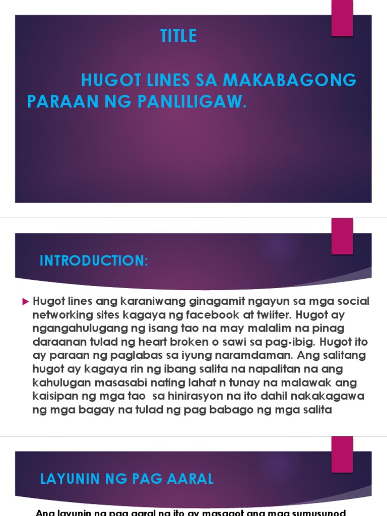 Ano ang kahalagahan ng hugot lines para sa mga kabataan. Ang pag-aaral na ito ay isinagawa upang malaman ang Kalagayan o sitwasyon ng wikang Filipino sa mga kabataan sa kasalukuyang panahon. Kaya naman hindi natin masisisi ang mga matatanda sa pag-iisip nila ng mga masasama sa mga kabataan. Hugot lines tungkol sa paksa ng kabataan sa makabagong panahon.