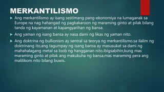 Ano ba ang layunin ng merkantilismo. Paglakas ng europe merkantilismo Jared Ram Juezan. Ang ganitong kaayusan ay tinawag na sistemang merkantilismo. Ang kayamanan ng isang bansa ay nakabatay.