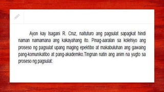 Narito ang ibat ibang anyo layunin gamit at katangian ng akademikong pagsulat. ANG KAHULUGAN AT KATUTURAN NG PAGSULAT 2. Layunin sa pagsulat -Filipino 1.