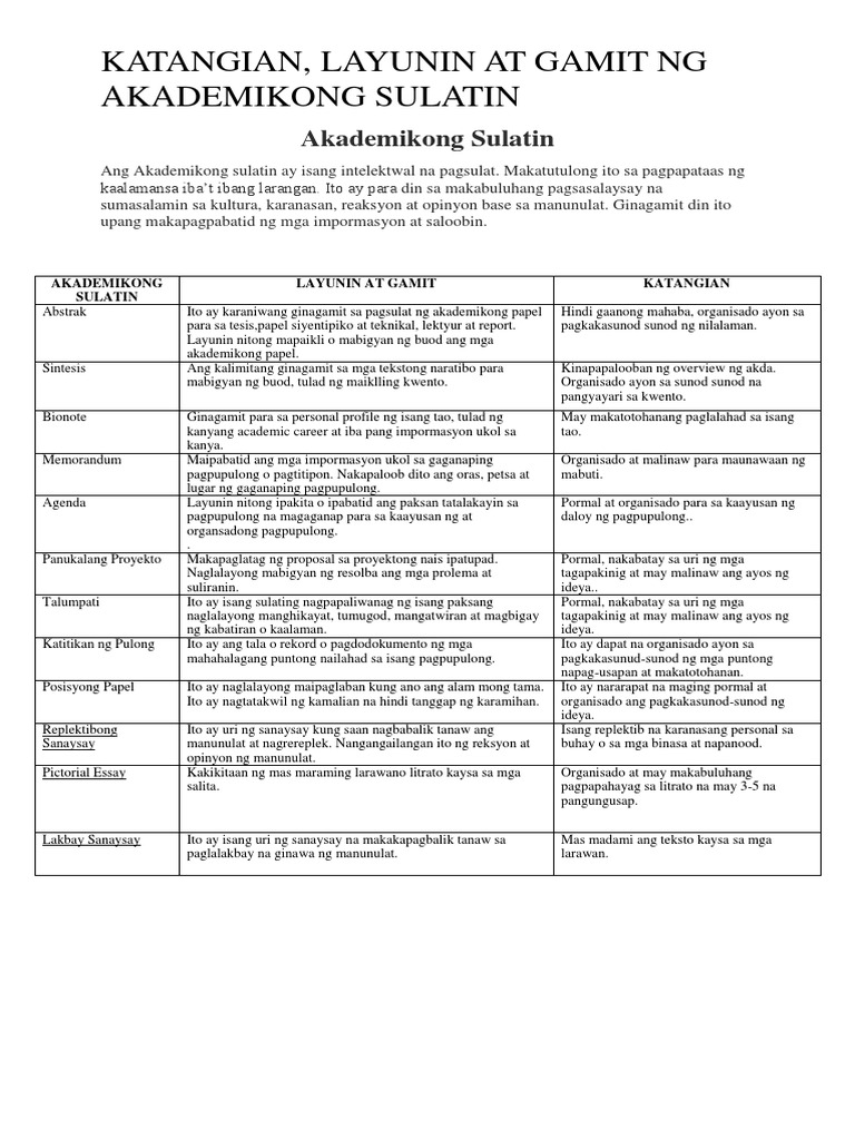 Ang layunin ng akademikong sulatin ay magsulat ng mga sanaysay na kapupulutan ng mga mahahalagang impormasyon at mga kaalaman na nakuha sa ibat-ibang karanasan ng mga taong may akda. 13 rows Akademikong Sulatin Ang akademikong sulatin ay isang uri ng. Gamit ng Tek-Bok na Sulatin Ulat panlaboratoryo Mga proyekto Mga panuto Mga dayagram 4.
