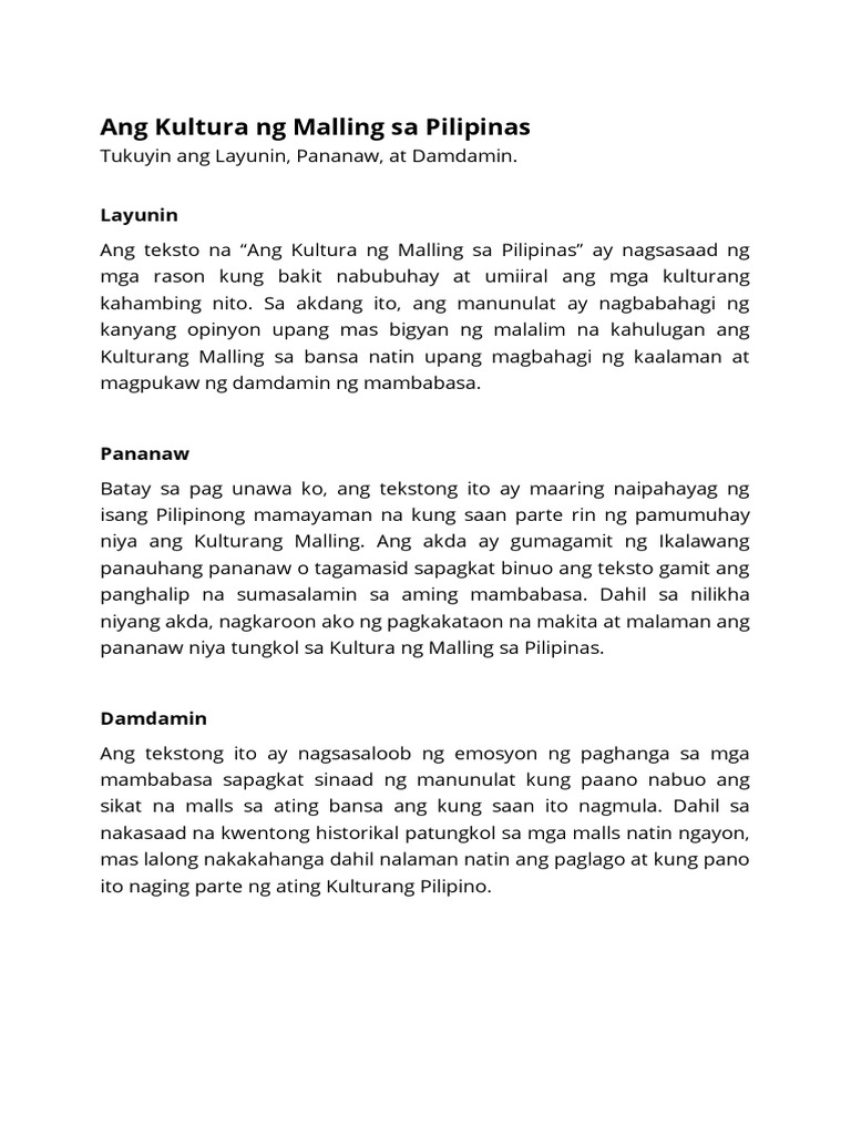 Ipinapahiwatig na pakiramdam ng manunulat sa teksto. Pagbigay ng interpretasyon sa mapa chart at talahanayan. Ano ang layunin pananaw at damdamin ng tekstong ang kultura ng malling sa pilipinas.