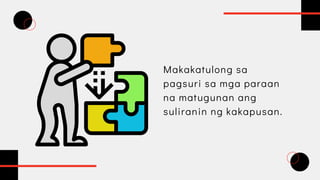 Tulad na lang ng maaari tayo ritong makakuha ng pagkain pang araw-araw. Matututuhan mo ang tamang desisyon sa tamang sitwasyon2Malalaman mo ang kahalagahan ng pagtupad at pagganap sa tungkulin ng isang indibidwal sapagkat sa ating kamay nakasalalay ang pag-unlad ng ekonomiya3. Ang mga gawain sa bahaging ito ay tutuklas sa kaalaman ng mga magaaral.